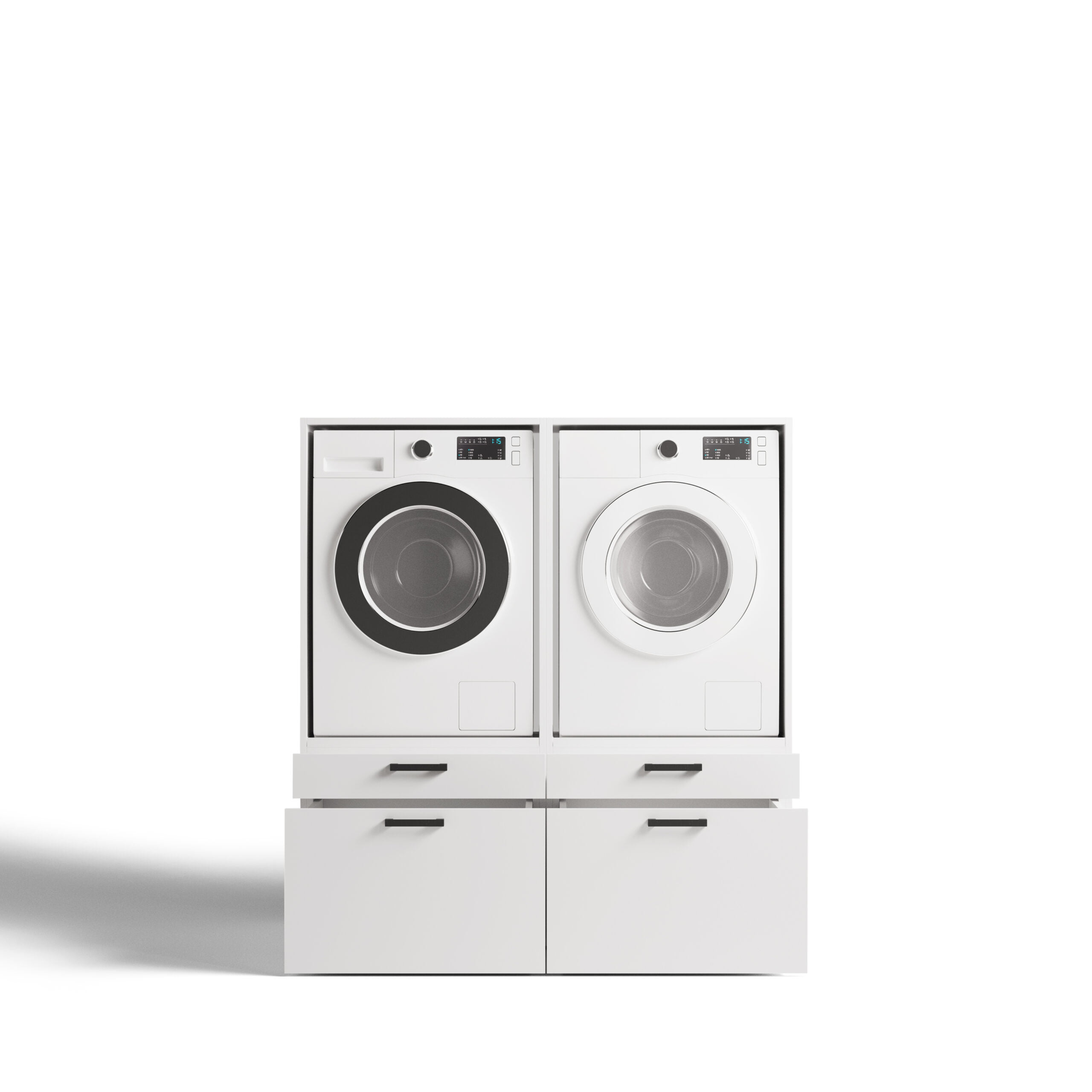 Door het modulaire systeem deel je de wasmachine kasten van Wasombouw in zoals jij wil. Zo staan jouw machines altijd op een voor jou ideale werkhoogte. Plaats deze daarnaast op de meegeleverde metalen bodemplaat met opstaande randen, die tegelijkertijd functioneert als lekbak.